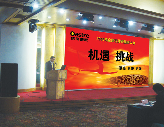 2007年12月底,歐圣陜西經銷商大會在西安隆重召開。歐圣總經理王濤、營銷總監黃水根、總監助理范輝軍親臨會議現場。與各代理商進行了深入的交流,在中心的管理、服務意識、業務培訓、品牌宣傳等方面展開了激烈的討論,并代表公司向在場的經銷商送上了節日的祝福!本次大會的口號為“迎、營、贏”,意為:陜西營銷中心在明年將雄心壯志迎接新挑戰、打造陜西第一品牌,成為當地木…