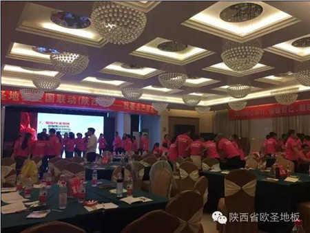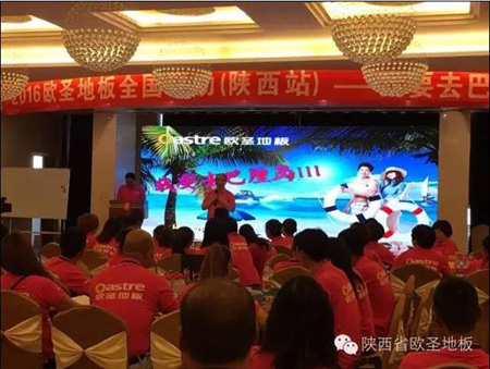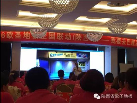 2016年5月9日-10日,“6月10日全國瘋搶歐圣地板活動陜西站經銷商誓師大會暨新品推介會”隆重召開,來自全省的百余名經銷商代表匯聚一堂。本次會議分為形象店參觀、新產品推介、6月10日全國瘋搶歐圣地板活動陜西站啟動宣講和培訓四大部分,出席會議的有江蘇歐圣木業有限公司總經理莊開鋒先生、江蘇歐圣木業有限公司營銷部李華賓部長、陜西圣澤偉業商貿有限公司總經理袁俊杰及副總經理朱奎香等各部門負責人。