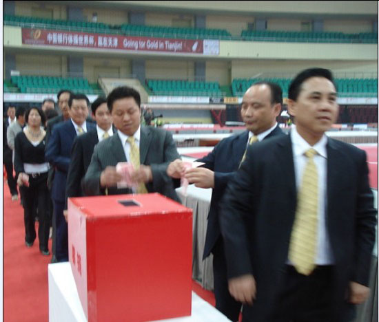 5月13日,2008體操世界杯現場,江蘇歐圣木業領導和經銷商們神色凝重,他們依次走到捐款箱前,通過捐款表達了自己的一片心意。