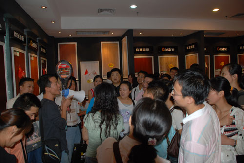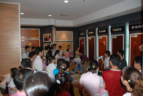 當天早晨,在歐圣地板陜西營銷中心和網站工作人員的組織下,大批網友在大明宮樓下歐圣地板簽到處簽到,并領取由營銷中心提供的精美手提袋和印有歐圣LOGO的飲料,之后集體步入歐圣地板南大明宮店面。好幾十人同時進入店面的場景不得不讓人興奮與激動。隨即,南大店長向所有現場網友詳細地介紹產品,網友們秩序井然,這也吸引來了不少顧客走進店面駐足停留,全場人氣量也達到了頂點。隨后網站的主持人向現場的網友們提問奧運相關問題,并贈送精美小禮品,活動現場氣氛頓時沸騰。當陜西營銷中心總經理袁俊杰先生出現在現場時,活動現場氣氛被推向了高潮,大家見到了照片中和諸多奧運體操冠軍留影的袁總也親臨現場,都興奮不已。
