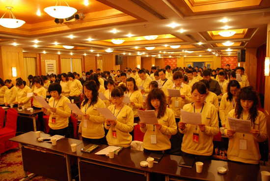 11月12日,來自全國各地的優秀導購員代表陸續齊集江蘇丹陽丹亞大酒店。13日清晨,天氣雖寒,但歐圣的優秀導購員代表們熱情仍然高漲。有的代表們13日凌晨才趕到酒店,有的甚至遇到大雪封路,他們也不顧疲勞,抖擻精神,很快便投入到了培訓的隊伍中。從組織到準備,總公司領導都非常重視,歐圣木業集團總經理王瑾女士、總經理助理尹萍女士、營銷總監毛偉先生也親臨培訓現場,參加了本次參觀交流活動。13日上午8時,在王總充滿激情的開幕詞中,2009歐圣地板第二屆全國優秀導購員代表培訓會隆重舉行。