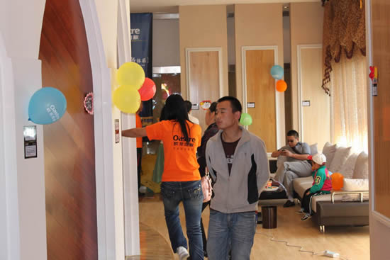 步入活動區域,精致奪目的歐圣地板專賣店新形象,簡約時尚的店堂風格,再看工作人員整齊劃一的包裝形象與飽滿的工作熱情,店內各種裝飾布置,促銷禮品的整齊擺放,鮮花糖果等細致服務等等,都為本次活動做好了充分的準備。