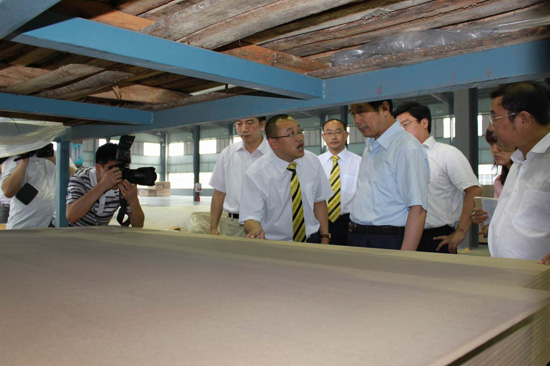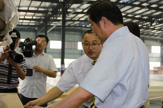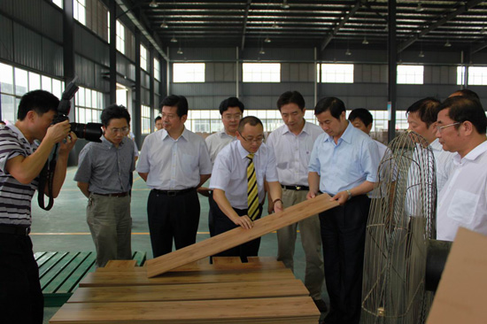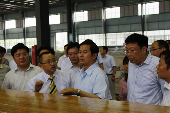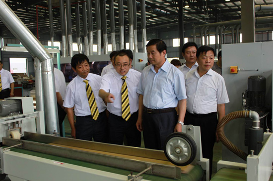 在王濤、酈林生等領(lǐng)導(dǎo)的陪同下,省、市領(lǐng)導(dǎo)分別參觀了我廠產(chǎn)品壓貼車間、裁板車間、開(kāi)槽車間等。其間,王濤王總給前來(lái)視察的領(lǐng)導(dǎo)們介紹了我廠生產(chǎn)經(jīng)營(yíng)情況,其中詳細(xì)介紹了我廠在自主研發(fā)和技術(shù)創(chuàng)新、信息化建設(shè)及其取得的成果。省、市領(lǐng)導(dǎo)在認(rèn)真聽(tīng)取介紹的過(guò)程中,還不時(shí)詢問(wèn)企業(yè)生產(chǎn)產(chǎn)品的種類及構(gòu)成,了解我廠的人員結(jié)構(gòu)組成、人才引進(jìn)等方面的工作情況;史和平也詳細(xì)詢問(wèn)了我廠未來(lái)幾年的發(fā)展規(guī)劃之后,風(fēng)趣地為其他領(lǐng)導(dǎo)介紹他所了解的我廠的一些情況,使視察現(xiàn)場(chǎng)充滿了生氣,同時(shí)也讓大家對(duì)我廠的情況有了更深入的了解。史和平聽(tīng)取了總經(jīng)理王濤對(duì)公司漣水木地板生產(chǎn)項(xiàng)目、家居研發(fā)生產(chǎn)項(xiàng)目等多個(gè)在建或已投產(chǎn)的情況匯報(bào)。史和平對(duì)歐圣地板成功進(jìn)軍高科技低碳木業(yè)制造業(yè),大力推進(jìn)科技研發(fā),多個(gè)高端木業(yè)項(xiàng)目相繼成功投產(chǎn)給予了充分肯定,并高度贊揚(yáng)歐圣地板干部員工特別能吃苦,特別能戰(zhàn)斗,特別能創(chuàng)新的開(kāi)拓精神。當(dāng)了解到歐圣地板憑借“鋼琴漆地板”已經(jīng)獲得國(guó)家行業(yè)標(biāo)準(zhǔn)起草單位稱號(hào),并獲得國(guó)家專利時(shí),他非常高興。