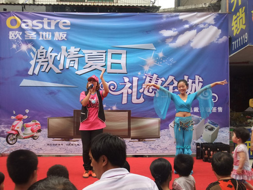 8月6日早上6點鐘,我們把所有現場布置完整,包括拱門,大雨傘,禮品的堆放等,氣勢宏偉,無時無刻不感受到忙碌與緊張的氣氛。活動期間,客戶絡繹不絕的走進店里購買地板,店外舞臺上的精彩表演吸引了大量流動行人。店內在九點半到10點鐘之間,人流量是最大的。11點半,我們總裁下榻店里簽售,在外等候簽單的客戶排起了一條幾十米長的隊伍,同時,加上店外舞臺上豐富多彩的節目,使整個活動推上了高潮。如此高的人氣,加上工作人員熱情的服務,短短2小時,簽下訂單超百,下午的時候,陸續又定了數十單。英山是一個小縣城,能在本次活動中取得如此佳績,我覺得非常的自豪與驕傲。歐圣,又一次成為英山地板行業中的佼佼者!