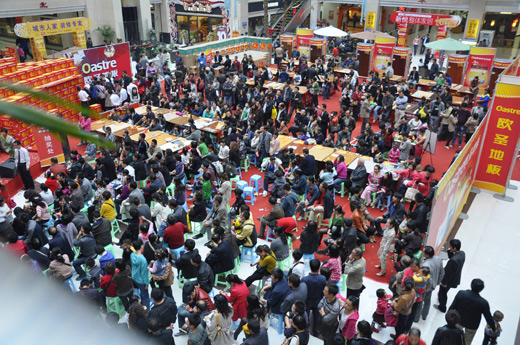 當您步入大明宮,感覺進入了花的海洋指引著您進入大明宮中廳。眼前豁然一亮,歐圣活動現場映入眼簾。伴隨著輕柔的音樂、LED背景滾動著精美的圖片、專業的品牌文化展示,有序的產品陳放、如山般的禮品堆頭,無不展示著我們的品牌和實力。