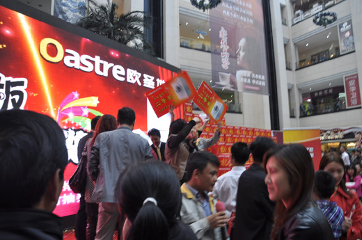 原計劃一點鐘的客戶簽到,十二時已人潮涌動,現場控制不住的局面迫使我們的活動提前進行,經過現場二個半小時500多戶1200多張抽獎卷的核對,三點半鐘準時開始抽獎,抽獎現場蜿蜒的長龍引起了北大明宮商場的高度重視,加派了安保人員,讓大家在國慶期間有一個安全,放心的購物環境。當一個個彩電、冰箱、洗衣機、微波爐……100多個大獎隨著客戶的抽出,客戶們的心情無比的激動,甚至有人直接在舞臺上高高躍起,現場的氛圍更是一浪高過一浪吶喊不斷,伴隨著吶喊聲七點鐘抽獎終于圓滿結束。
