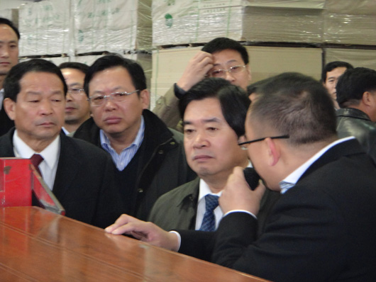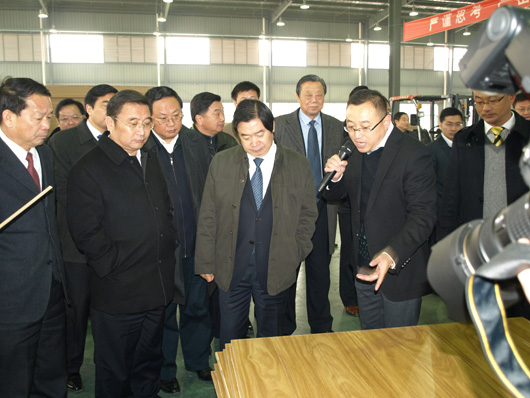 2011年12月13日上午10點20分左右,市委書記劉永忠、淮安市市長高雪坤、淮安市市委常委漣水縣縣委書記李衛平及重大項目組來我公司蘇北生產基地觀摩,各部門勇爭一流、爭先跨越的發展勢頭和紅紅火火、爭分奪秒的建設場面鼓舞人心,催人奮進。劉永忠和高雪坤、李衛平以及重大項目組等市領導一行先后觀摩了公司的壓貼車間、裁板車間、開槽車間、包裝車間、淋漆線等各道工序,王總介紹說:“我們蘇北生產基地總項目占地240畝,投資總額5500萬美元,注冊資金1000萬美元。規劃建筑面積12萬平米,包括八幢廠房、辦公樓、研發中心等。主要設備有壓機、德產豪邁機、裁板線、淋漆線、滾漆線、印刷線、包裝線等設備100臺套,主要生產知名品牌歐圣地板系列產品,產品主要銷往東南亞、歐美地區和國內各大城市。