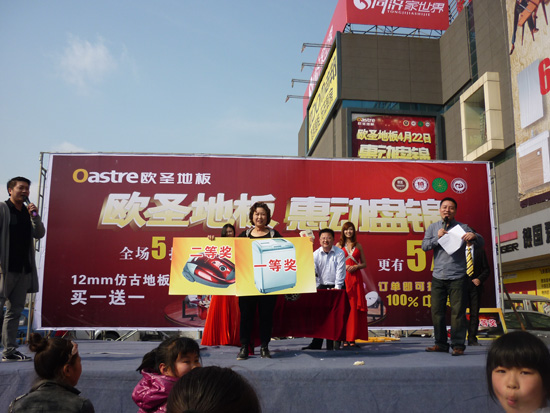 4月的黑土地氣溫才稍許有些回升,沉寂一個冬天的建材市場剛剛有點復蘇,歐圣地板瞅準時機,打響了市場大型活動的第一槍。“地板買1平送1平,定單就有機會抽取42寸液晶電視!”走在盤錦的大街小巷,到處可以看到歐圣地板讓人心動的廣告。持續(xù)一個月的廣告轟炸收到了良好的效果,在預熱期間不斷的有客戶到店里詢價選花色定單。活動前期準備的獎券已經(jīng)告急,不得已又加急印制了一批獎券才保證了活動的正常舉行。