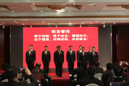 2015年1月7日,“江蘇歐圣木業(yè)有限公司”2014年度重點(diǎn)經(jīng)銷(xiāo)商代表大會(huì)暨年終總結(jié)大會(huì),在丹陽(yáng)市新世紀(jì)大酒店一樓會(huì)議廳隆重召開(kāi)。出席此次大會(huì)的成員有公司董事長(zhǎng)、營(yíng)銷(xiāo)部經(jīng)理等公司管理層領(lǐng)導(dǎo),各分支機(jī)構(gòu)及部門(mén)員工,以及全國(guó)各地重點(diǎn)經(jīng)銷(xiāo)商代表共二百余人參加。會(huì)議對(duì)2014年公司業(yè)績(jī)進(jìn)行了評(píng)價(jià)總結(jié),并對(duì)2015年的工作作出了戰(zhàn)略規(guī)劃部署。